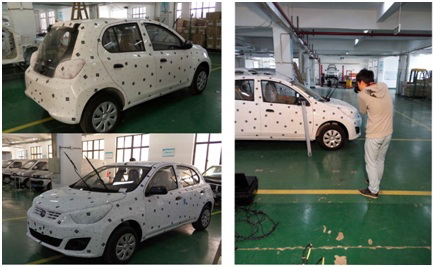 流程: 以下圖掃描整車(chē)為例,首先,為整車(chē)布點(diǎn),并用全局?jǐn)z影測(cè)量系統(tǒng)獲取標(biāo)記點(diǎn)的空間三維數(shù)據(jù)。